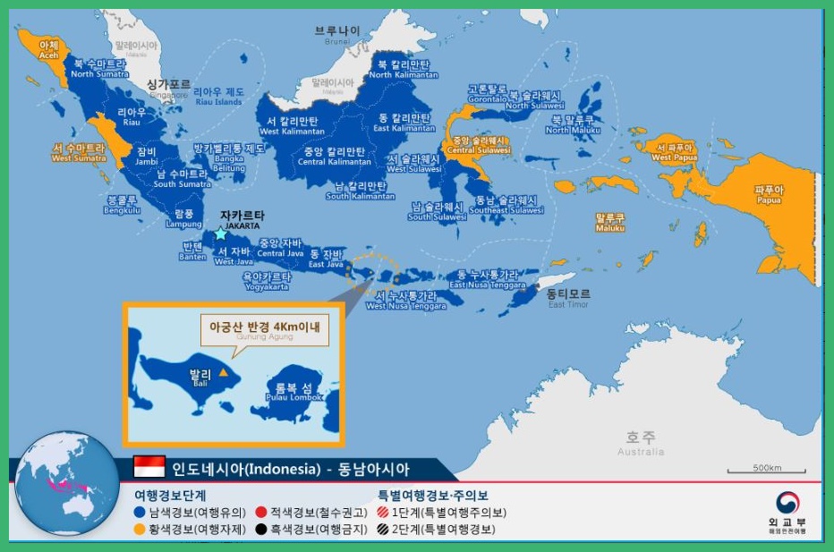 인도네시아의 해외여행안전 경보단계를 알려드리겠습니다. 우선 여행자제 지역입니다. 인도네시아의 여행자제 지역은 아체 주, 서수마트라 주, 말루꾸 주, 중부 슬라웨시 주, 파푸아 주, 발리 아궁화산 4km이내 입니다.