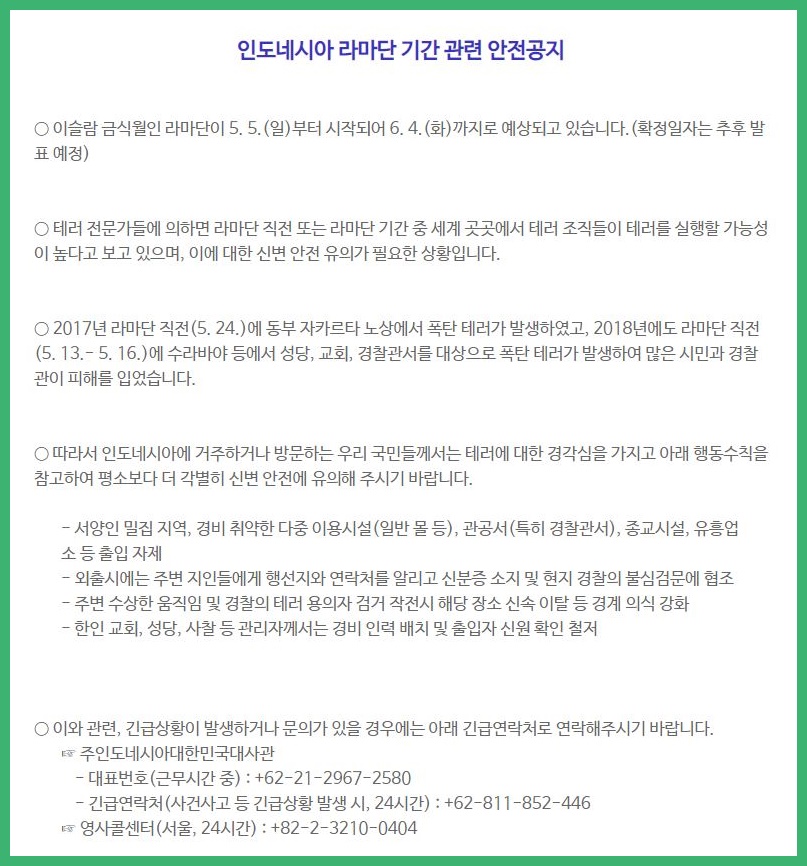 인도네시아의 이슬람 금식월인 라다단이 5월5일부터 6월4일, 약 한달간 예상되고 있습니다. 이 기간에는 세계 곳곳에서 테러 조직들이 테러를 발생시키는 가능성이 높다고 하니 신변 안전에 유의를 필요로 합니다. 따라서 라마단 기간을 피해서 인도네시아나 여행을 하는것을 권장합니다.