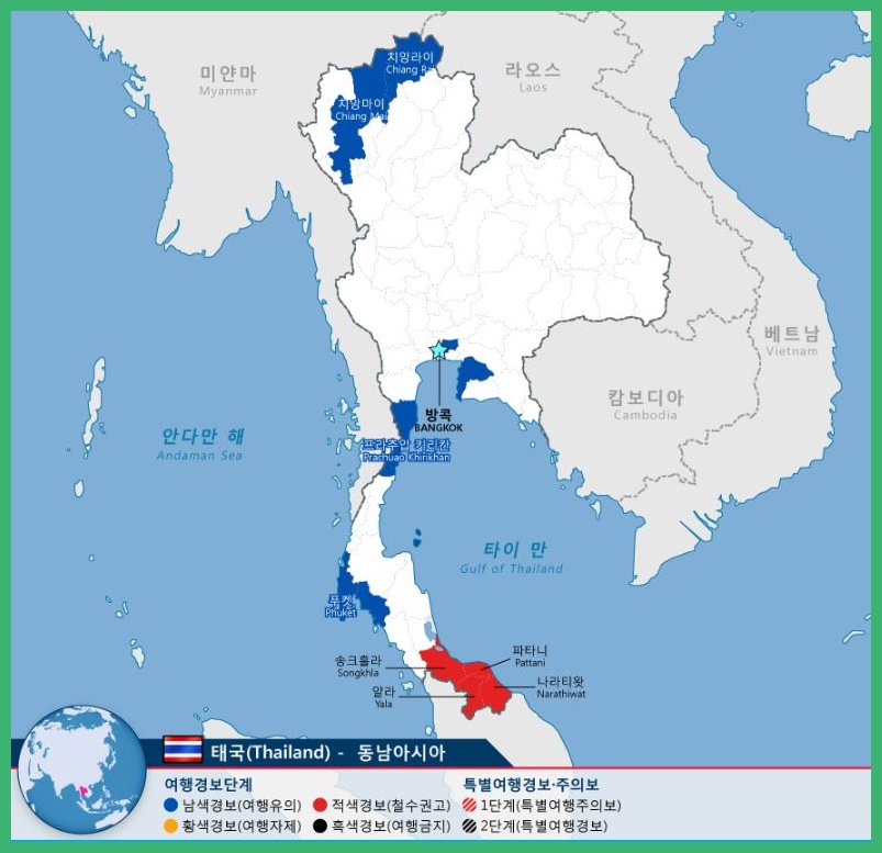 태국은 의외로 청정구역 같습니다. 여행유의 지역과 적색경보 지역이 조금밖에 없습니다.