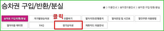 승차권 이용안내 메뉴를 클릭하면 승차권 구입/반환/분실 화면으로 이동합니다. 여기서 정기승차권 버튼을 클릭하면 우리가 오늘 알고자하는 정기승차권 화면으로 이동합니다. 자, 눌러볼까요?