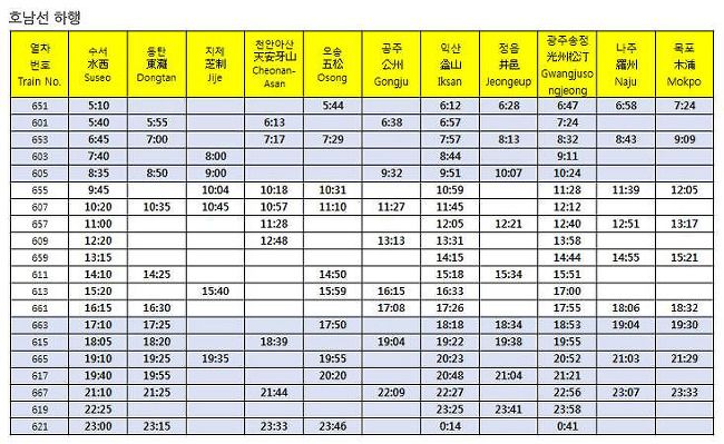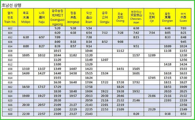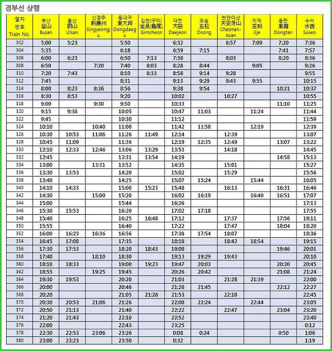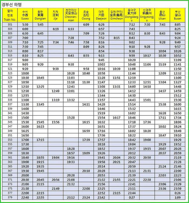 경부선 하행 운행시간표입니다. 진한 색깔이 출퇴근 시간을 표시한것이네요. 출퇴근시간표는 사진을 찍어서 가지고 다니시는것이 좋을것 같다고 꾸벅이가 팁을 드립니다.