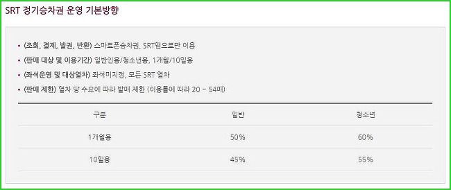주말 및 공휴일에도 SRT 정기승차권을 평일과 동일하게 적용한것은 괜찮은 방식 같습니다. 우리나라도 이제는 사용자 편의성을 중시하는 문화가 많아지는것 같아서 좋네요. 다른 사항들은 위의 표를 보시고 참고하면 될 것 같습니다.