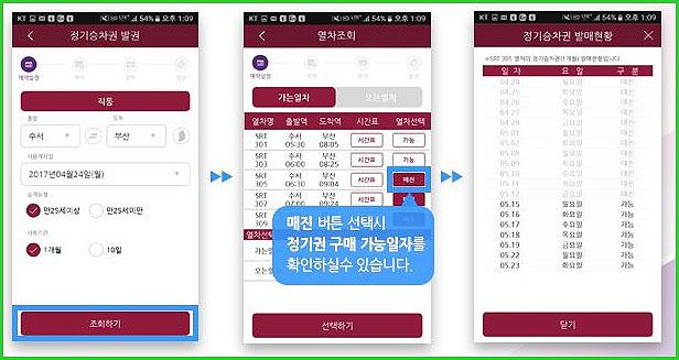 앞서 말씀드렸다시피 SRT 정기승차권은 스마트폰 앱으로만 사용이 가능합니다. 그림처럼 사용하기 위해서 구매를 해야하지만 한정된 수량으로 인하여 매진되었을때는 정기권 구매 가능일자를 확인후 구매를 하시면 될것 같습니다.