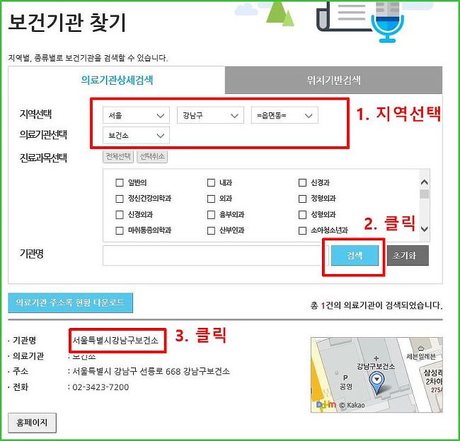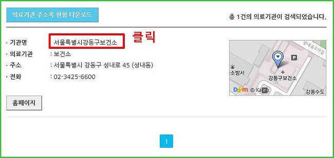 같은 방식으로 서울의 강남구 보건소를 찾았습니다. 클릭해보겠습니다.