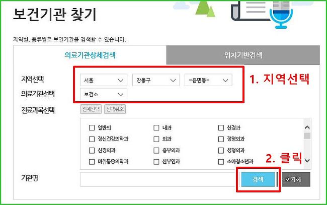 지역을 차례로 선택을 합니다. 저는 서울, 강동구까지 선택했습니다. 보건소가 동마다 있지는 않으니까요.