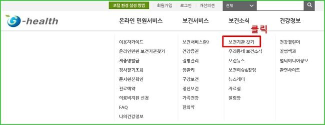 G-Health 홈페이지에 잘 들어오셨나요? 여기서 빨간 네모안의 보건기관 찾기를 마우스로 클릭하시면 됩니다.