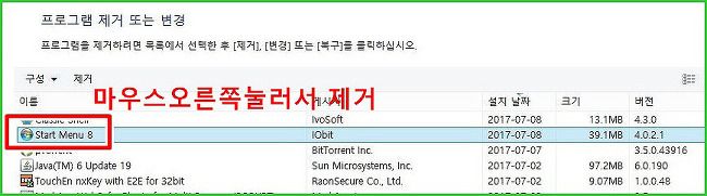 우리가 설칙사 Start Menu8이 보입니다. 우리는 마우스로 클릭후 오른쪽을 눌러서 제거를해보겠습니다. 어차피 30일만 사용할 수 있으니 과감하게 지워보겠습니다.
