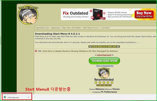 제가 쓰고 있는 것이 크롬이라서 왼쪽 밑에 보시면 Start Menu8 프로그램을 다운받고 있다는 메세지가 보일것입니다.