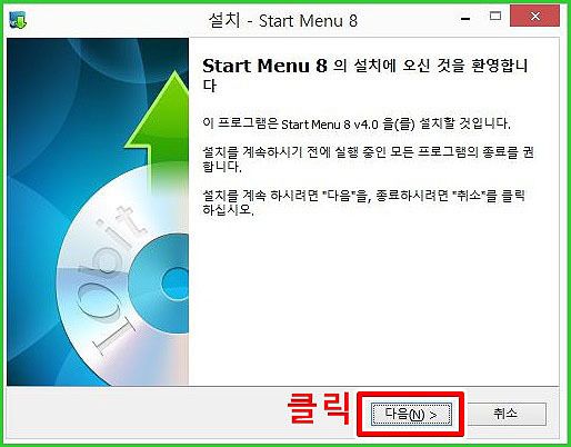 Start Menu8 첫 설치 화면입니다. 설치에 오신 것을 환영한다고 하네요. 부끄럽게시리. 이제 다음을 클릭합니다.