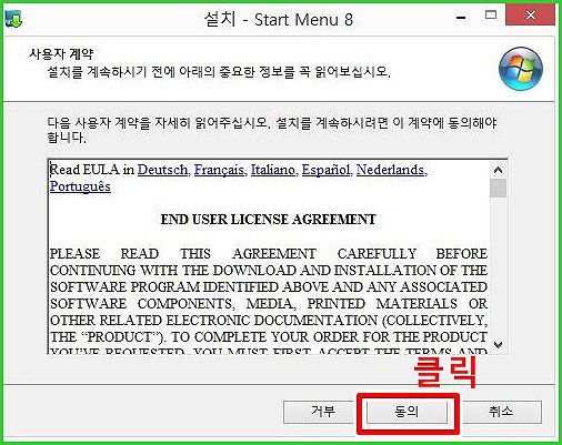 다운을 다 받으셨다면 화살표를 눌러서 열기메뉴를 클릭하시면 됩니다. 이제부터 Start Menu8를 설치하는법이 나옵니다. 특별히 어렵지 않습니다.