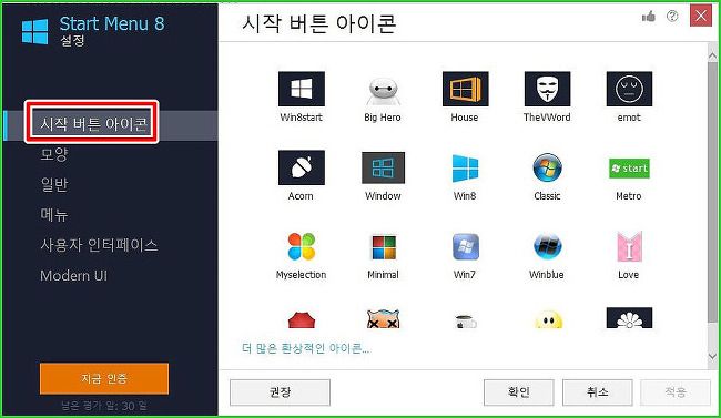Start Menu8 설정 메뉴가 화면에 나옵니다. 계속 밑에 보시면 지금 인증이 떠있지만 우선은 Start Menu8의 기능에 대해서 설명을 드리겠습니다. 시작버튼 아이콘 설정에 대한 메뉴입니다. 사용하시는분들이 원하는 아이콘을 선택하시면 됩니다.