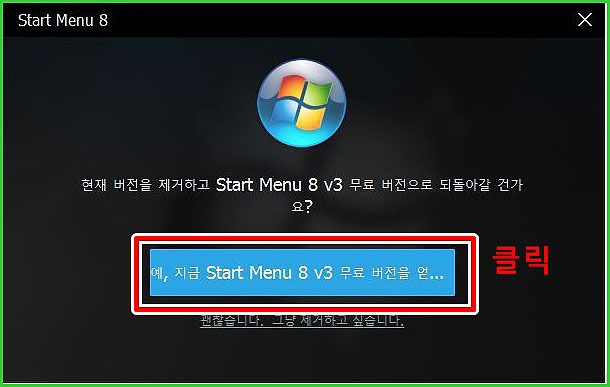 삭제를 선택하지 나타난 이 화면은 뭐지? 같이 읽어 보겠습니다. Start Menu8 V3 무료 버전으로 되돌아갈 건지를 물어봅니다. 이게 바로 우리가 원했던 것입니다. 무료버전입니다. 이런것을 숨겨놓았다니. 당연히 우리는 무료버전을 사용하기를 원합니다. 제거하지 않고 파란 버튼을 과감히 눌러줍니다.