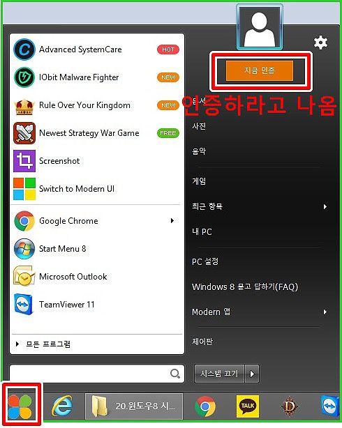 바탕화면의 시작버튼이 변경되었습니다. 이제부터는 윈도우8에서도 시작버튼을 사용할 수 있는 것일까요? 그런데 자꾸 지금인증 이라는 빨간버튼이 눈에 거슬립니다.