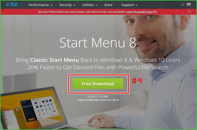 우선 윈도우8 시작버튼을 만들려면 Start Menu8을 다운받아야겠지요? 어디서 받냐고요? 주소를 링크했습니다. => http://www.iobit.com/en/iobitstartmenu8.php 제가 편하게 링크해놓았습니다. 살짝 눌러주시면 됩니다.