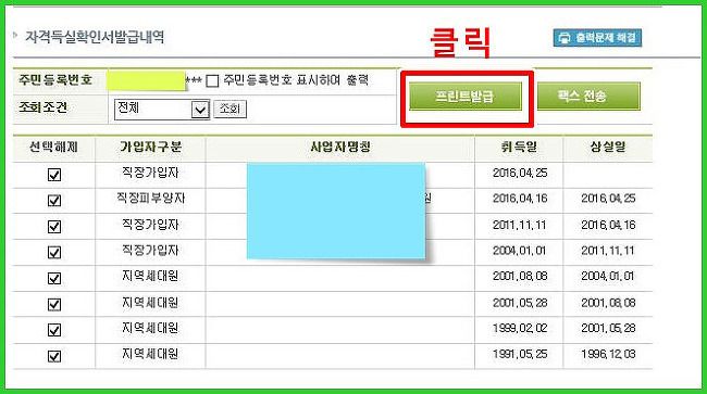 공인인증서 확인 절차를 거치면 바로 자격득실확인서 발급내역 화면이 보입니다. 너무나 간단히 간단하게 나오네요. 화면에서 확인만 할 수도 있고 서류가 필요할시 빨간박스의 내용처럼 프린트발급도 할 수 있습니다.