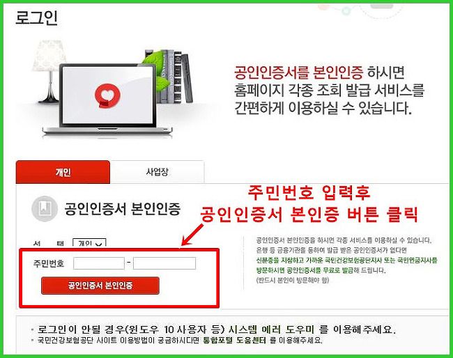 저는 저의 건강보험자격득실을 확인할 예정이므로 개인으로 본인인증을 하겠습니다. 주민등록번호를 입력후 공인인증서 본인인증 빨간 버튼을 눌러주세요.