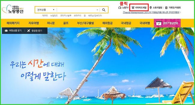노랑풍선 홈페이지 입니다. 벌써부터 설레입니다. 여기서 오른쪽 위에 있는 리미티드세일메뉴를 클릭합니다.