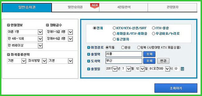 다시 한번 itx청춘을 선택후 여정경로, 출발역, 도착역, 출발일등을 선택후 조회하기 버튼을
