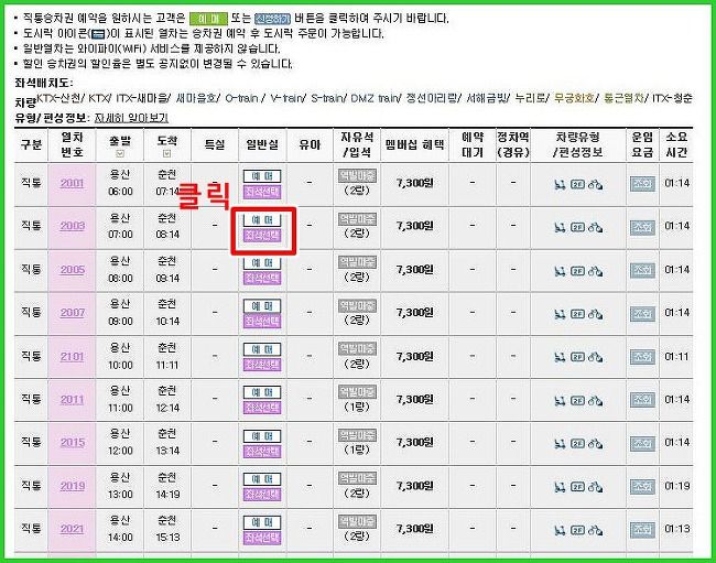 이제 운임요금과 열차의 운행정보도 확인을 하였으니 예매를 하러 떠나볼까요? 원하시는 시간대의 열차의 예매버튼을 클릭합니다.