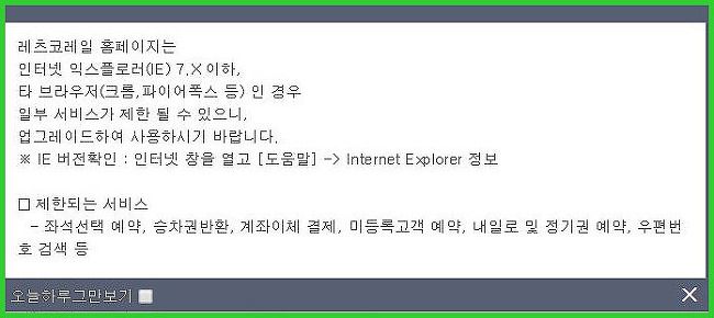 레츠코레일 홈페이지에 들어가자마자 바로 알람메세지가 뜹니다. 바로 크롬으로 사용할 때 일부 서비스가 안될수 있다는 주의 메세지가 뜹니다. 신나게 가야되는 여행에서 이런 문제점이 발생하면 안되겠죠? 크롬을 닫고 저는 익스플로러를 다시 띄워서 레츠코레일 홈페이지에 다시 접속을 했습니다.