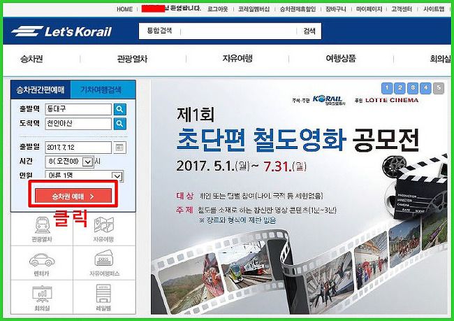 로그인을 성공했습니다. 맨 위의 줄을 보시면 저를 환영한다고 되어있습니다. 이제부터는 다시 똑같은 패턴의 반복이 되겠지만 기분좋은 여행에서 화를 낼수는 없겠죠? 다시 승차권 예매를 클릭합니다.