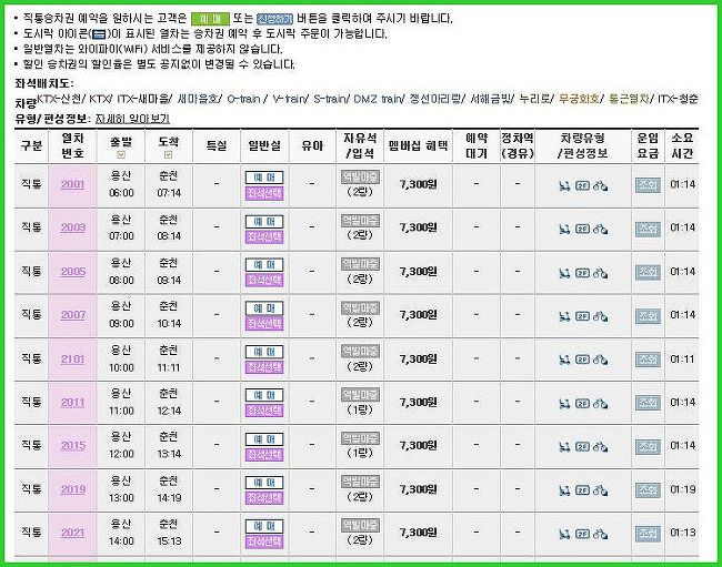 itx 청춘열차의 운행정보가 나옵니다. 열차번호, 출발/도착 시각, 운행요금, 소요시간등을 확인할 수 있습니다.