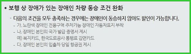 보행 상 장애가 있는 장애인 차량 동승 조건 완화에 대한 안내문입니다. 장애인 분들은 발급 증명서(복지카드, 한국도로공사 통행료 감면카드)를 제시하면 할인을 받을 수 있습니다.