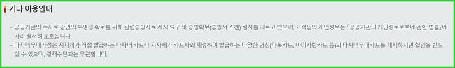 기타 이용안내 안내문입니다. 관련증빙자료는 공공기기관의 개인정보보호에 관한 법률에 따라 철저히 보호가 된다고 하니 안심하셔도 된다고 합니다. 또한 다자녀우대카드를 이용하여 할인을 받을수 있다고 합니다.