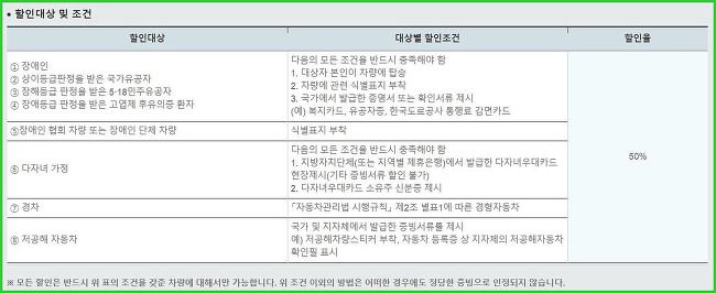 할인대상 및 조건에 대한 안내문입니다. 할인율은 50%입니다. 장애인, 국가유공자, 5.18민주유공자, 고엽제 후유의증 환자분들은 할인율 받을수 있는데 대상자 본인이 차량에 탑승하거나 차량에 관련 식별표지가 부착되어있어야 합니다.