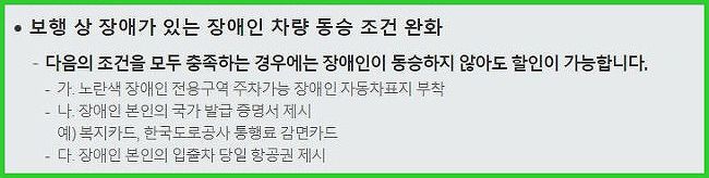 보행 상 장애가 있는 장애인 차량 동승 조건도 완화되었습니다. 노란색 장애인 전용구역 주차가능 장애인 자동차표지 부착이 되었거나, 장애인 본인의 국가 발급 증명서를 제시하면 할인이 가능하니 참고하시면 좋을 것 같습니다.