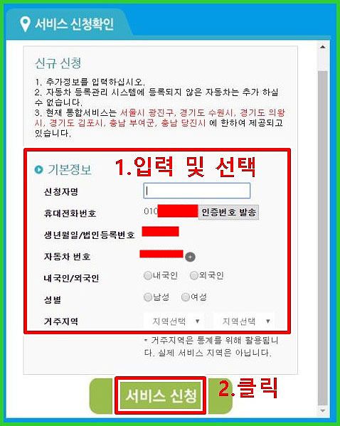 이제 본격적으로 서비스신청을 해보겠습니다. 우선 기본정보를 입력합니다. 휴대폰 전화번호, 자신의 자동차번호, 생년월일이나 법인등록번호를 입력합니다.