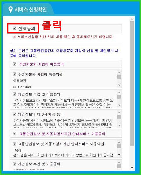 서비스 신청확인입니다. 동의를 구하는 것이 많네요. 우리는 이럴때 전체동의를 눌러준다면 간단히 넘어갈수 있겠죠? 전체동의를 한후 조금만 내리시면 확인 버튼이 있으므로 우리 함께 눌러보겠습니다.