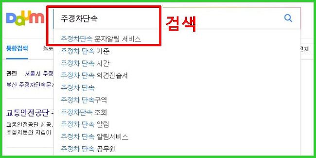 저는 다음(Daum)에서 검색을 해보았습니다. 주정차단속까지만 입력했는데도 제일 첫번째로 주정차단속 문자알림 서비스 키워드가 보입니다. 고맙게도 수고를 덜할 수 있었습니다.