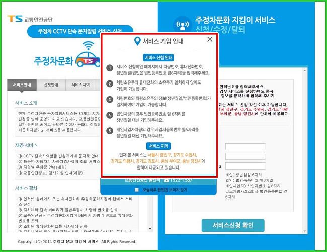 홈페이지에 들어왔습니다. 서비스 가입 안내에 대한 알람 창이 떠 있습니다. 서비스 신청안내와 서비스 지역에 대하여 간략하게 소개하고 있습니다. 알람창을 닫고 본격적으로 문자알림 서비스를 신청하여 과태료를 피할수 있도록 해야겠지요?