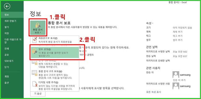 ▼ 정보 - 통합 문서 보호 메뉴를 클릭합니다.